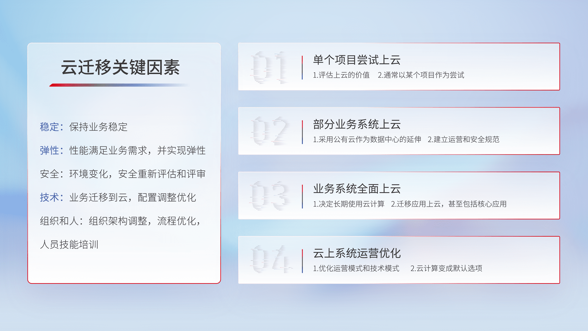 结合实际业务,,,,从规划设计、、、云平台选型、、、云原生改造、、数据迁移、、集成交付,,,迁移全过程为客户识别最佳上云路径,,,,做好风险识别管理,,,,设计网络架构、、身份权限、、安全审计合规、、、操作审计、、、、日志审计、、、、监控告警策略、、多站点容灾设计等,,对云上基础设施进行整体规划,,,提升IT治理水平,,以满足弹性、、高可用、、、、高性能的需求。。。。